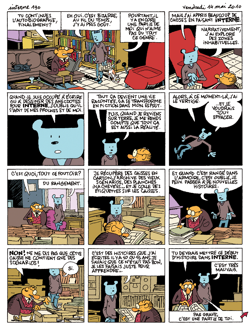 Au départ, c’est mon fils qui m’a fait un blog. Après avoir publié quelques dessins d’observation d’après nature, je me suis rendu compte que ça n’avait aucun intérêt pour les visiteurs. J’ai donc commencé à raconter des anecdotes du quotidien, histoire de proposer des choses à lire, sans que je doive me prendre la tête pour inventer des fictions. Au départ, l’autobiographie me fait peur, je trouve l’exercice obscène. Sans le blog, je n’aurais pas fait “Interne”. J’ai hésité longtemps avant d’en faire un livre, ce qui m’a motivé, c’est de laisser une trace pour mes enfants.