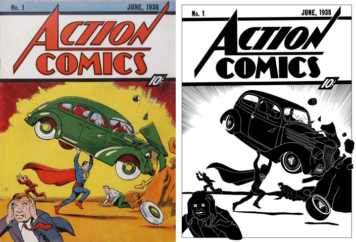 L’idée géniale, donc simple, de Robert Goodin a été de demander à des dessinateurs de faire une « reprise » (cover donc) de la « couverture » (cover encore), d’un comics ou d’un album de bande dessinée de leur choix. Contrainte presque oulipienne, ils doivent conserver les éléments originaux (titre, situation, personnages…).