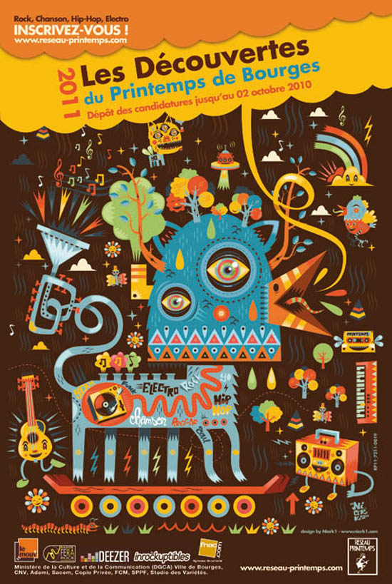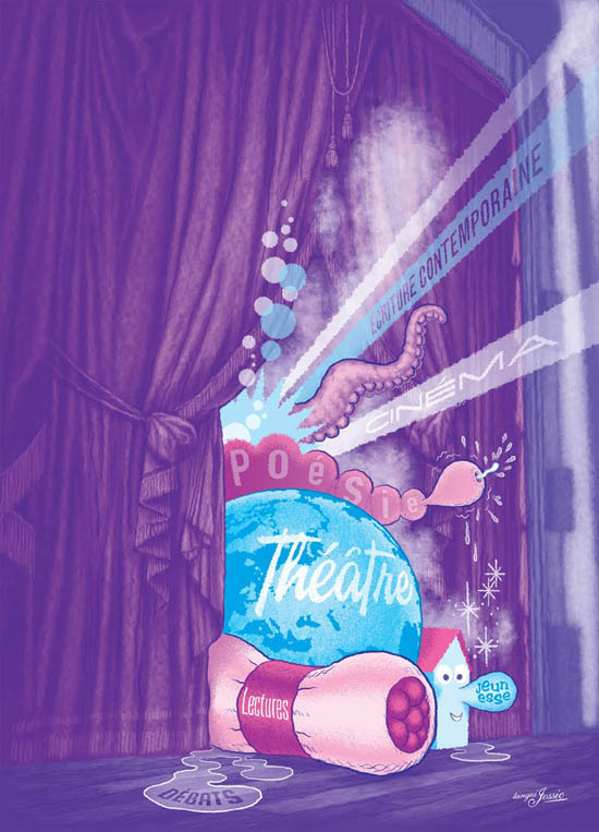 Deuxième livraison pour cette rubrique appelée à être mensuelle. Vous pouvez toujours participer en nous soumettant vos trouvailles (eoaffiche@gmail.com). Les affiches doivent être dessinées, les auteurs identifiés et les événements à venir. [Nous rajouterons cependant quelques affiches hors actualité à la fin – 2 ce mois-ci. Car lorsque une affiche est belle, elle le reste !]. Les noms en bleu renvoient aux sites des illustrateurs. Nous vous conseillons vivement d’aller y faire un tour. Ils sont pleins de trésors.