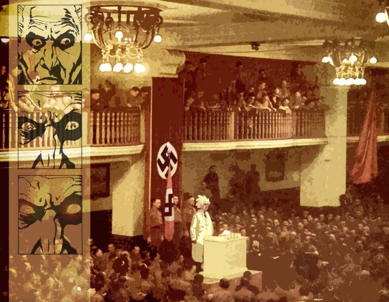Pour bien montrer l’importance européenne du récit, les auteurs (Serge Lehmann & Fabrice Colin au texte, Gess aux images) nous donnent une carte en préambule avec la situation géopolitique telle qu’on la connaissait entre les deux horreurs qui ont massacré notre continent au siècle dernier, au millénaire d’avant, hier donc. L’Allemagne nazie figurée par Mabuse, le collectivisme stalinien avec la masse des «Nous autres », les «hommes faisceaux» du Gog italien et le point brutal de la Phalange espagnole en complément des puissances nocives, les super méchants de l’époque. En face et en France l’institut du Radium des Curie épaulé par un héros anglais et en conflit avec un héros français ambigu. Bref on est juste avant guerre, la Super Science de cet univers à peine parallèle rayonne pour le bien grâce au rationalisme déjà discrédité des scientistes français ou dans le mal sans nuance des alliés de M. le maudit (c’est sa nature au mal, il ne relativise pas, il est absolu et bête).