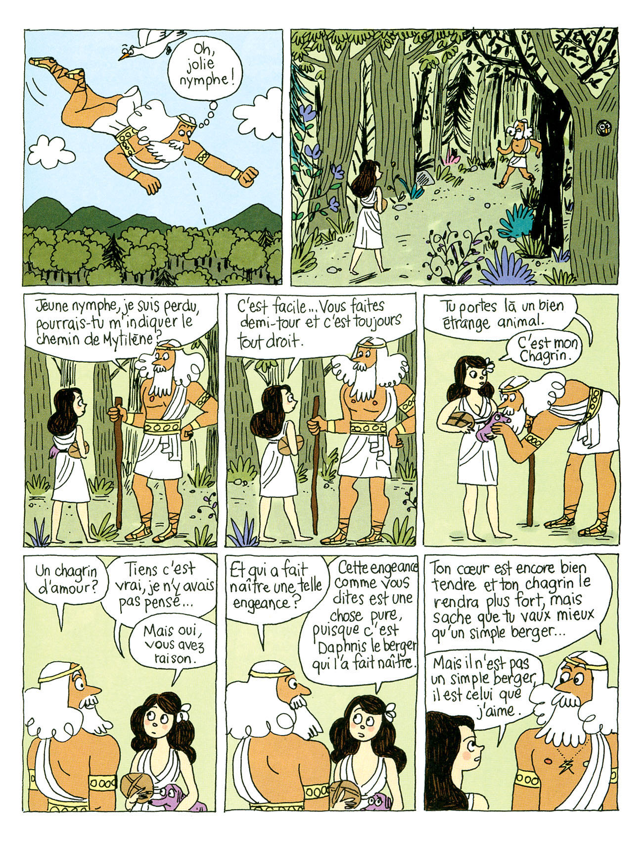 Depuis la parution en 2006 d’Orage et Désespoir, on guette toujours avec impatience et curiosité des nouvelles de Lucie Durbiano. Récit d’amours adolescentes et de vacances à la mer, Orage et Désespoir surprenait par un final surnaturel et gothique à la Lovecraft, après avoir débuté comme une bluette de Rohmer… Et avec Lo, si l’on pense encore à l’auteur de Pauline à la plage, c’est plutôt pour son côté Amours d’Astrée et de Céladon. Dans Lo comme dans le dernier opus du vieux maître es-marivaudages, des jeunes gens, faussement candides et plutôt délurés, vivent leur éducation sentimentale en toge et sandales dans un cadre de poésie bucolique.
