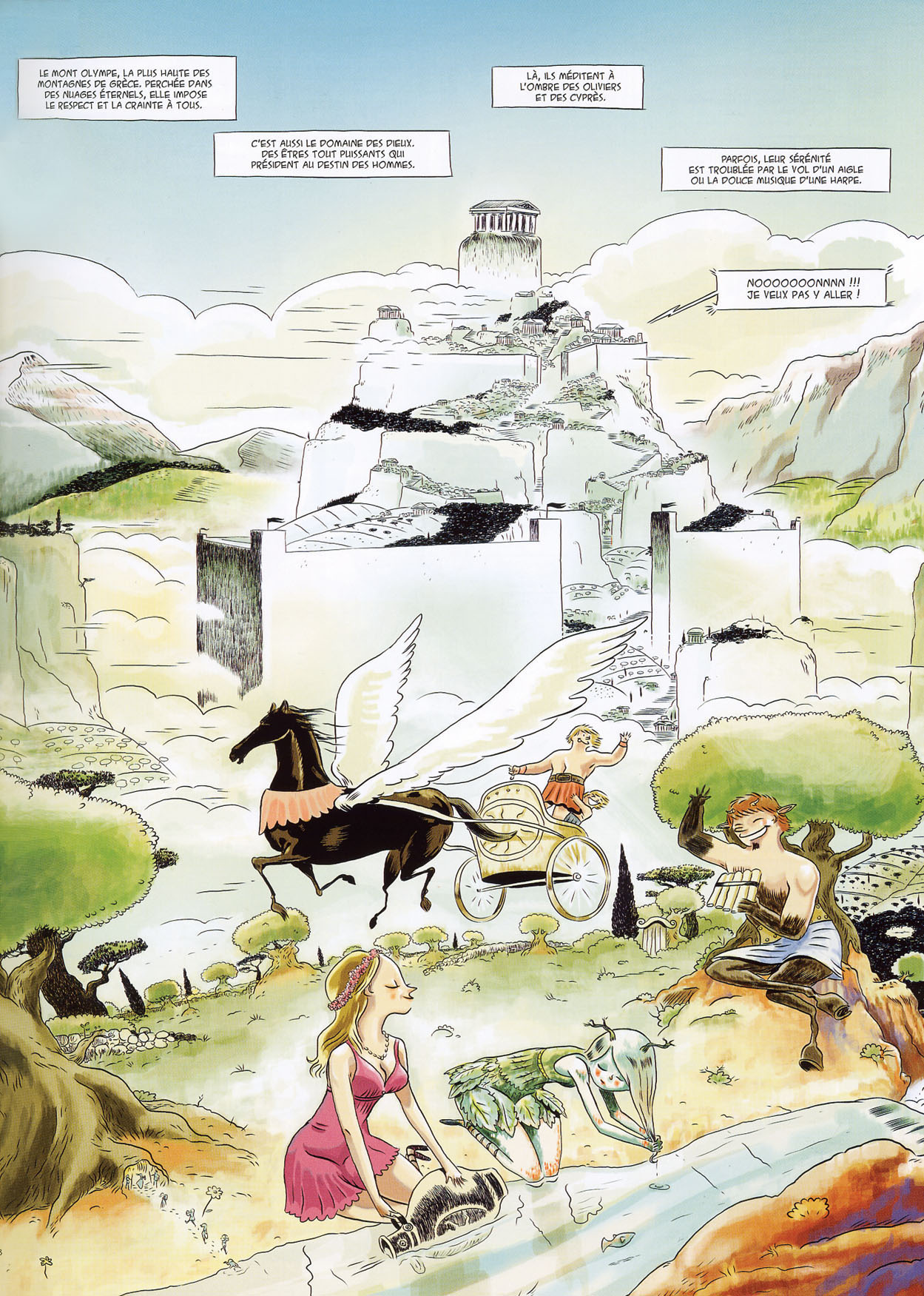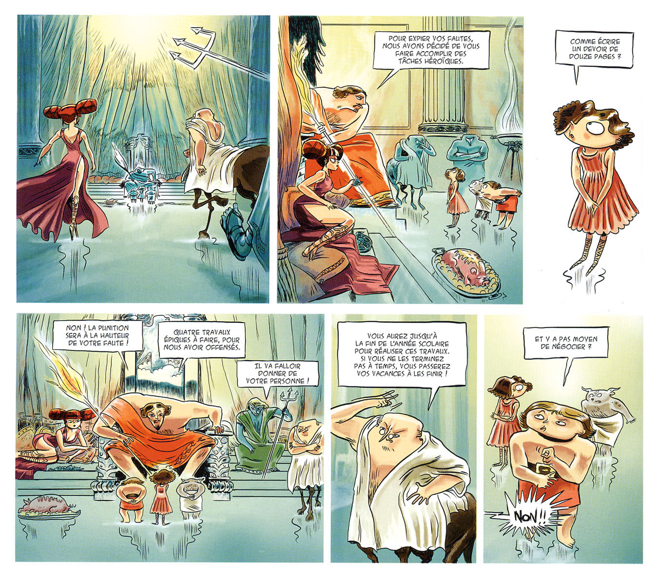Les quatre quêtes entreprises par le trio mythologique fournissent à cet album jeunesse son lot de péripéties menées à fond la caisse, c’est un peu la loi du genre. Dans l’ordre : rapporter un cheveu de la Méduse, trouver au fond des mers une perle de Thétis, descendre aux enfers pour dérober à Hadès son casque d’invisibilité, et enfin rapporter un élixir d’amour concocté par la magicienne Circé. L’habileté des auteurs de Prunelle étant de faire de leur récit d’aventures une visite des lieux et du panthéon de la Mythologie gréco-romaine.