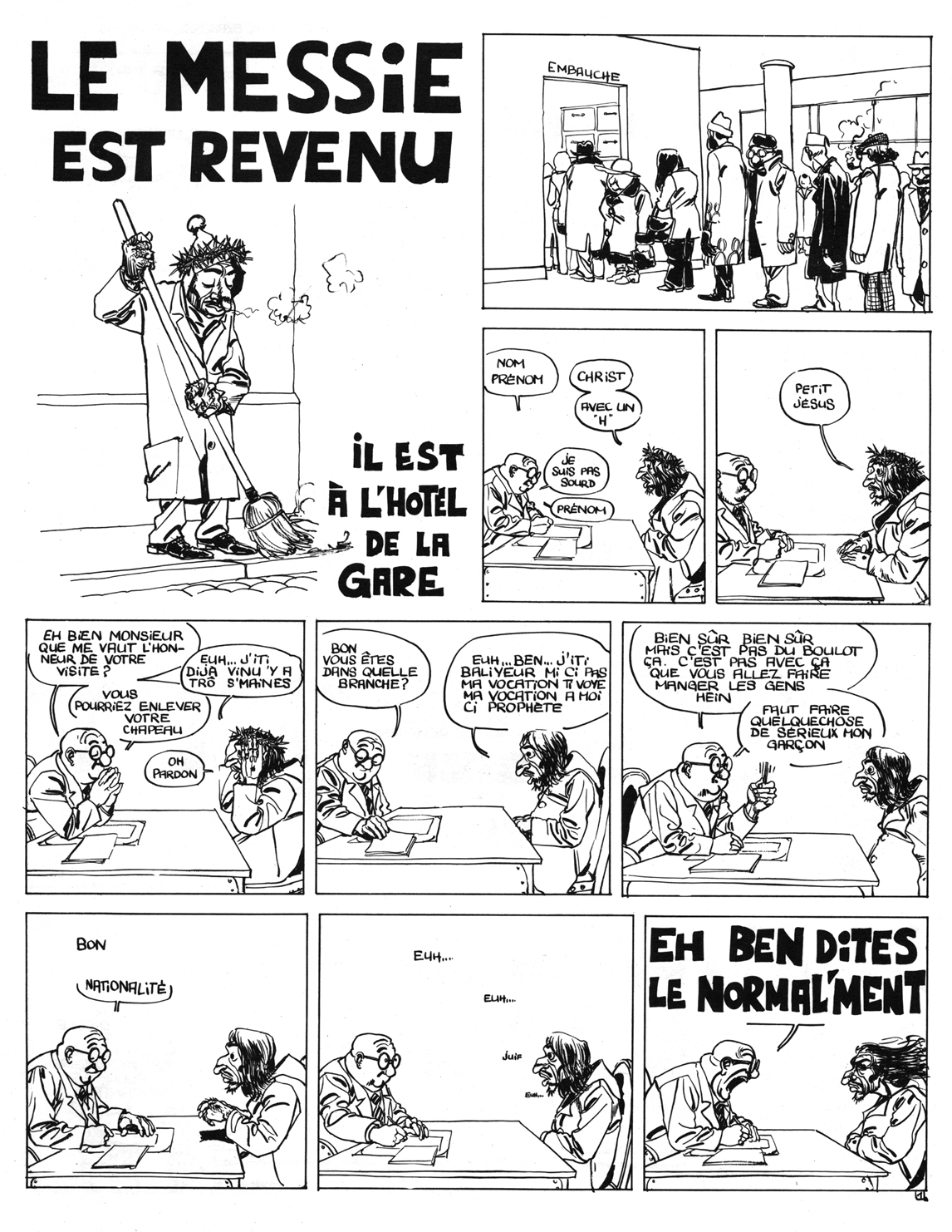 Sans être vraiment parti Daniel Goossens est toujours revenu. Et avec lui un personnage classique, au charme et à l’humour buriné par les siècles : Jesus Christ. Déjà, il y a longtemps, en 1979 chez Fluide Glacial, Goossens l’avait proclamé : Le messie est revenu et il n’était, comme de juste, qu’un pauvre travailleur émigré devant justifier à un bureau d’embauche sa qualité de prophète. Depuis il a grandi en majesté et ce sont deux êtres de légende, Georges & Louis (mais surtout Louis) qui se chargent de narrer sa geste.