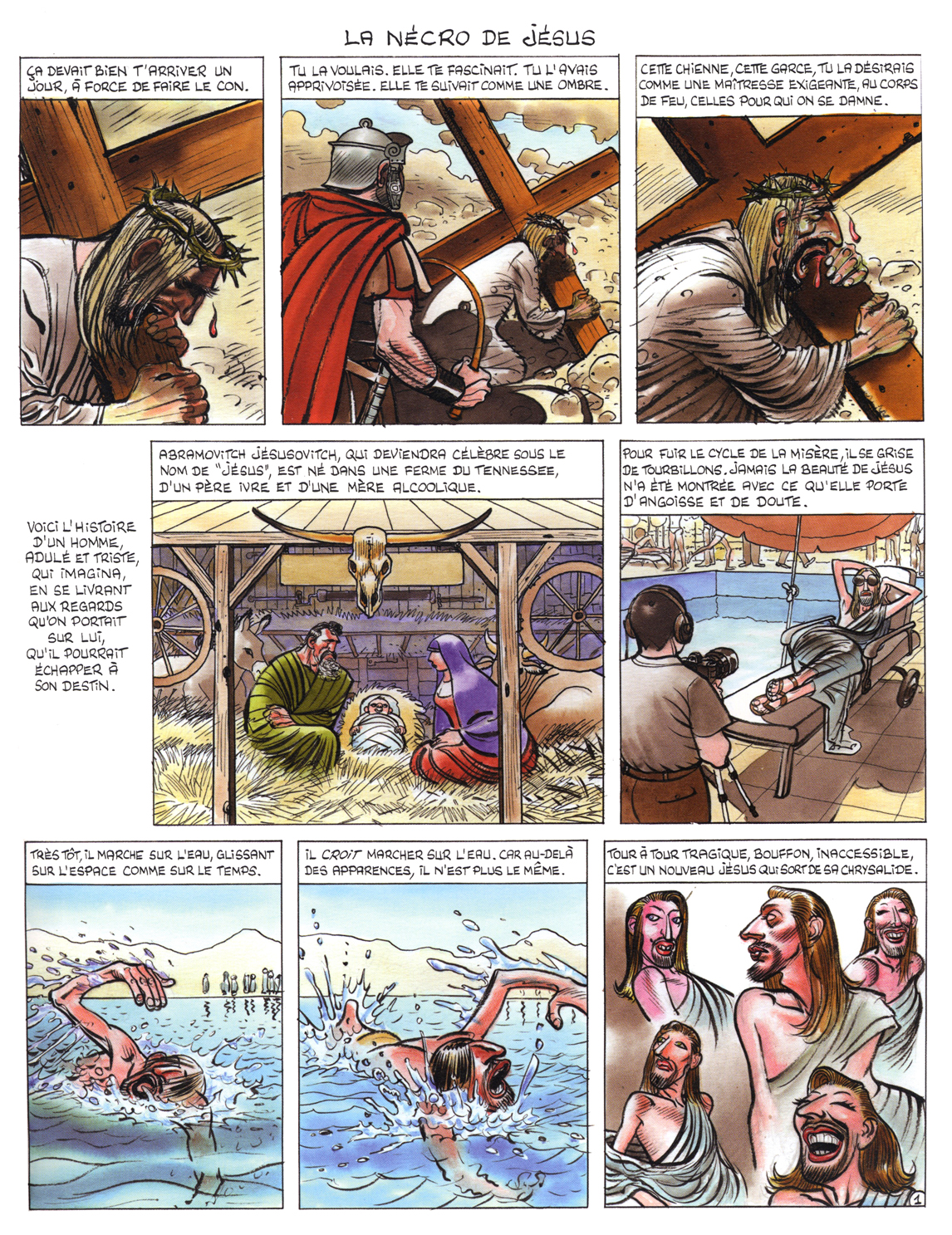 Et là je vais pouvoir prendre une revanche attendue depuis 1994 ! Alors, pour le tout premier numéro de TAO, j’interrogeais Daniel Goossens sous l’angle de l’humour construit, réfléchi, bref à l’aune de son taf d’informaticien de pointe. Il ne cessait de me renvoyer dans les cordes d’un comique beaucoup plus réaliste. Et voici donc que Jésus revient parmi les siens au sein d’une prépublication toujours chez Fluide et édité en volume ces jours-ci. Et qu’y trouvons nous ? Un travail très précis, reprenant les choses à la base, à La Bible, au désespoir de Louis puisqu’il « raconte toute l’histoire de l’Univers » un autre de ses projets « bon il raconte pas la fin, mais c’est tout juste, j’ai horreur quand on raconte la fin ». Il y a ici déconstruction de la légende, avec sous texte moderne freudien (incarné par le Dr Watson), mise en abyme de la question morale (rappelée par la Vache qui rit), révolte sous-jacente quant à l’indifférence des masses (les gens sont comme les vaches, toujours, « rien ne les étonne, ils s’en foutent, ils broutent » alors que Louis est « comme un train bourré de technologie de pointe, qui passe »).