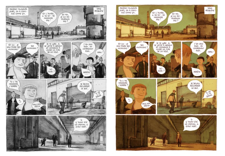 J’ai pensé au cinéma expressionniste et fait quelques pages en travaillant l’éclairage et la profondeur de champ, avec un travail de lavis préalable pour apporter un peu de fragilité et cacher le lissé du traitement ordinateur. Il n’y avait pas de budget et c’est finalement Florent et Jérôme qui se sont chargés de faire les lavis, j’ai fait la partie « ordinateur ». C’était bien plus intéressant que la plupart des mises en couleurs classiques que j’ai pu faire. C’est ce type de choses qui m’amusent, un travail de recherche, pas forcément en quadri.