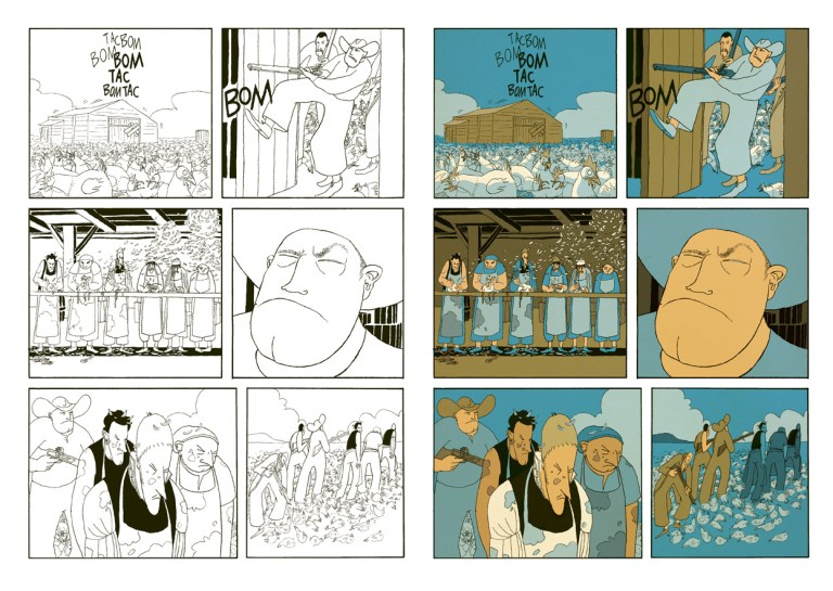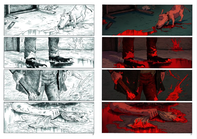 Maintenant, j’essaie de mettre en valeur les éléments présents dans le dessin, de les faire résonner entre eux sans rien toucher. Je me concentre sur le récit, le rythme, les séquences, les moments clés.
