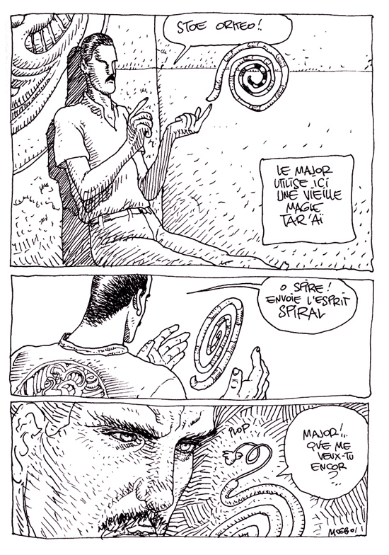 Le major est mis en boîte, réduit à une fonction d’oracle. Sur la boite un 8 qui est un infini redressé semblable à « B » le nom du désert. Plus loin il parle de ‘l’infini désert B ». Par une fente le Major répond à des questions que Mœbiusmet dans la bouche de voyageurs. La 1ère divise dialectiquement la réalité pour séparer le bien du mal. Aboutissant à des paradoxes inévitables dans cette logique bêtement symétrique, le Major s’en évade en imaginant des formes devenant réelles dans ce désert faussement vierge.
