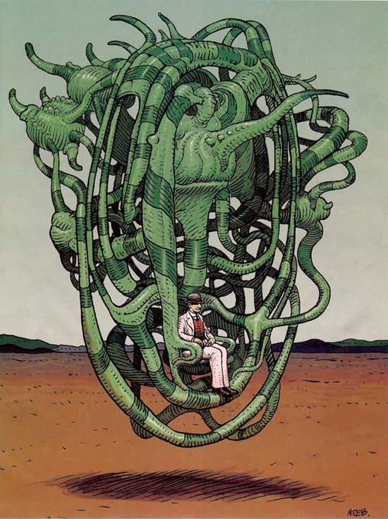 Avec La faune de Mars il décrit ce qui pourrait être des personnages familiers du Major mais lors ils seraient aussitôt assujettis à une demande de sens. Là point. Juste la jouissance de l’image devenu un être possible et potentiel fournisseur d’histoires. Avec cette faune l’auteur se libère vraiment des limites humaines d’un scénario, Alors que Mœbius avec son Major Fatal, ses portes ouvertes ou hermétiques, ses clefs déclenchant des rêves infinis mais s’effondrant inévitablement sur eux mêmes se dessine comme une silhouette se détachant de l’ombre de personnages au verbe d’autant plus eschatologique qu’il se parle à lui-même, au milieu de cette Faune muette sa voix résonne comme un discours silencieux riche en paraboles lumineuses.