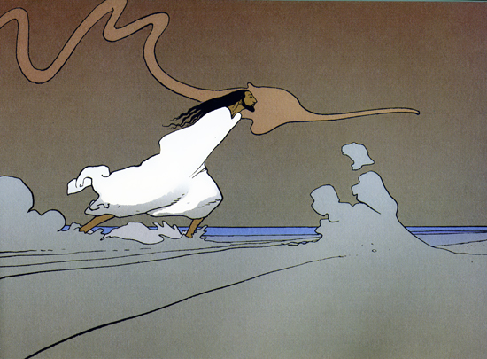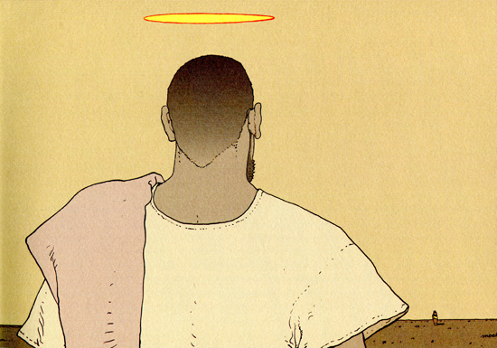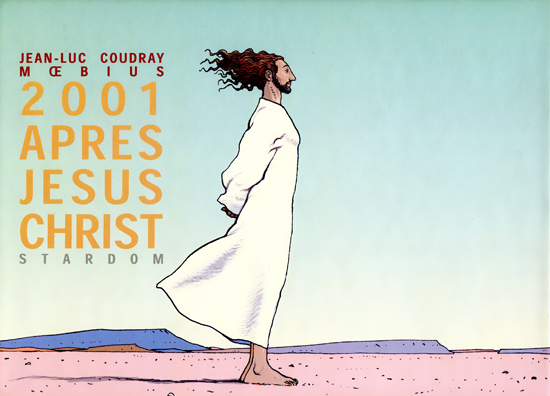 Cette fois-ci, c’est moi qui l’avais sollicité en lui envoyant mon texte sur le Christ. Je l’ai revu au festival d’Angoulème, où il m’a dit que mon texte était tombé au moment où il fallait pour lui remonter le moral. Il était dans une période où il ne croyait plus trop à ce qu’il faisait, ne savait plus trop où il allait. Mon texte sur le Christ alternait des histoires humoristiques, dans l’esprit de Monsieur Mouche, avec des descriptions de l’état d’extase de Jésus, en relation avec la nature. Mœbius était particulièrement intéressé par ces descriptions d’extase. Il m’a dit que je devrais être patient car il fallait qu’il libère du temps. J’ai attendu quatre ans, mais il a réalisé les dessins. À chaque dessin, le Christ était un personnage différent. Il n’y avait qu’un Christ mais une multiplicité de représentations. Il évoluait dans des perspectives écrasées qui agrandissaient les horizons. Les dessins renvoyaient à un invisible au-delà de la page. Il m’avait proposé le titre 2001 après Jésus Christ en hommage à 2001 l’Odyssée de l’espace.
