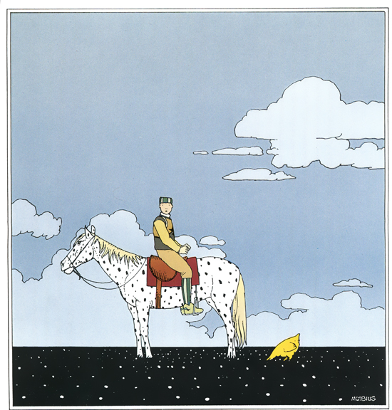 À sa demande, j’ai écrit une suite sur le Christ. Le projet n’a pas pu se réaliser, pour des raisons privées n’ayant rien à voir avec notre relation ou des motifs artistiques. L’écriture de ce texte a été pour moi un moment important. Car il s’agissait d’une inversion. J’ai écrit à partir des dessins du premier livre, influencé par son interprétation. Je trouve que le second texte, encore inédit, développe plus avant ce qui était en sourdine dans le premier, et c’est dû à l’enthousiasme de cette rencontre. Par extension, les dessins en général de Mœbius m’ont parlé différemment. Leur évocation de l’étrangeté, leur aptitude à suggérer un monde véritable par le simple jeu du bizarre, leur capacité à élever au mythe, c’est-à-dire à l’intemporalité, des scènes à priori simplement narratives, unifiant le relatif et l’absolu, m’ont donné une assurance dans l’écriture de mes propres textes.