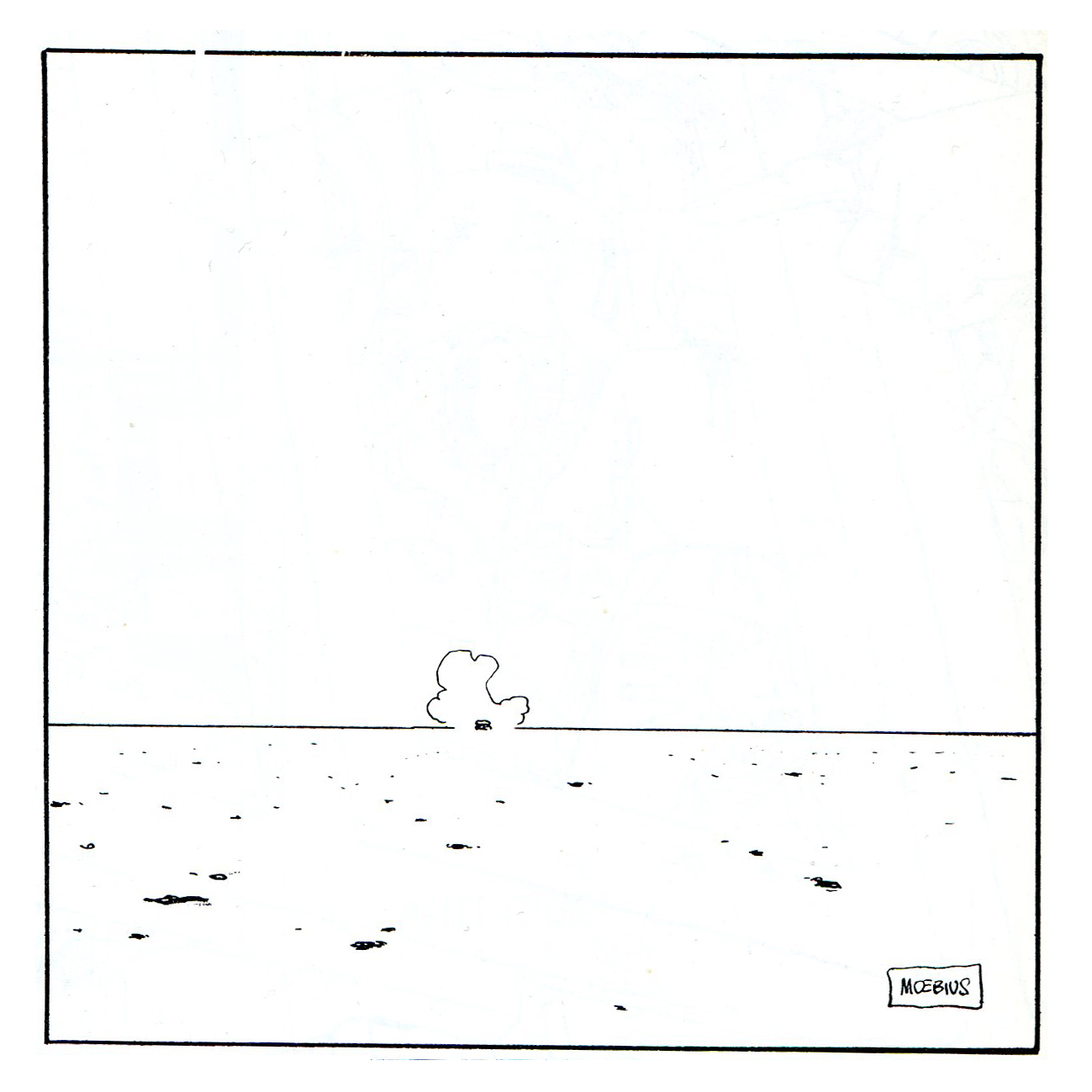 « Là où j’admire le plus Mœbius c’est dans la simplicité de certaines de ses images. Bien sûr, personne ne dessine les scènes de foule comme lui, des centaines de personnages dans des décors détaillés et pourtant, tout reste parfaitement lisible, on se demande comment il fait. Alors que cette image-ci, tout le monde pourrait la dessiner. Mais justement :