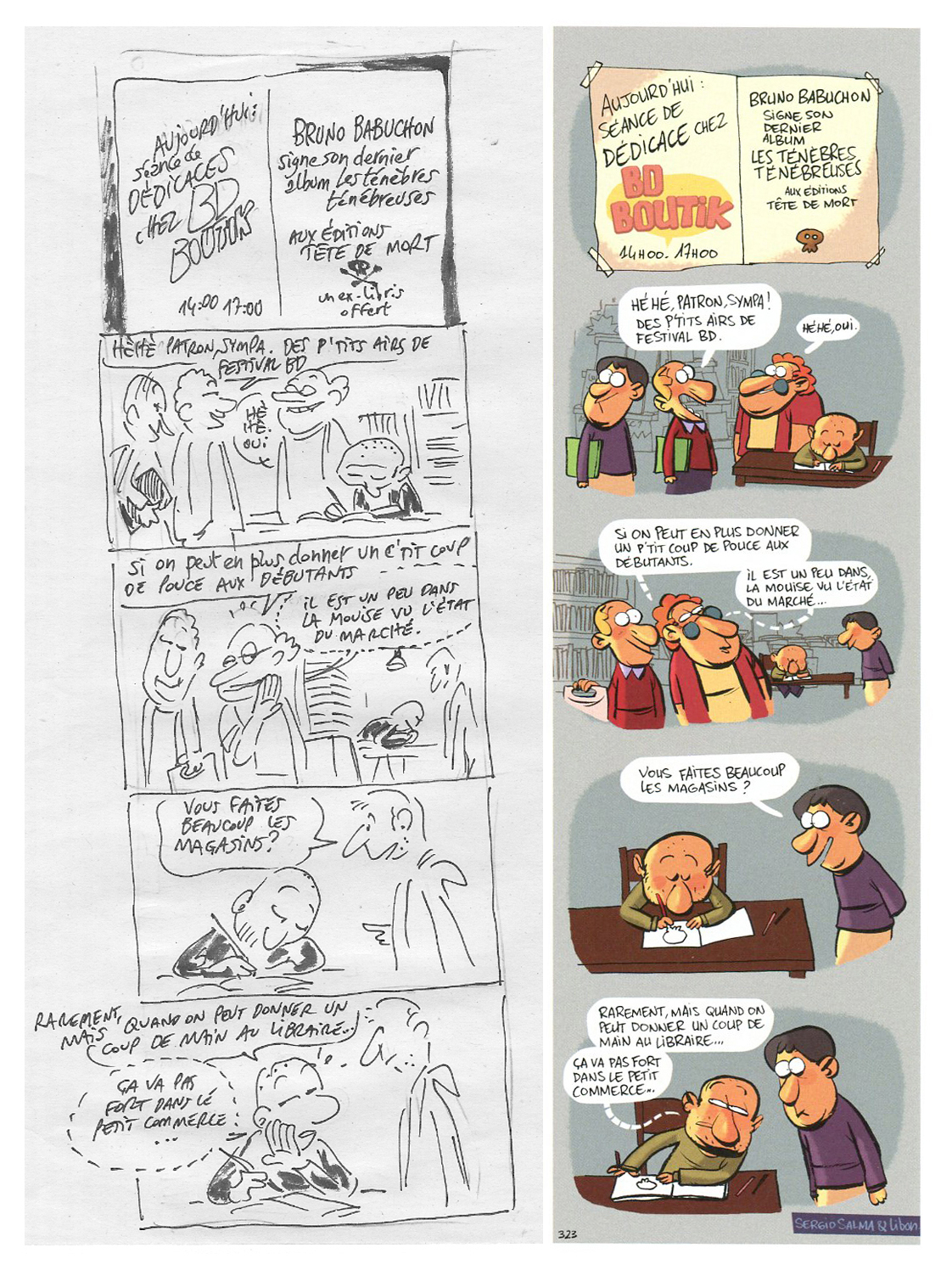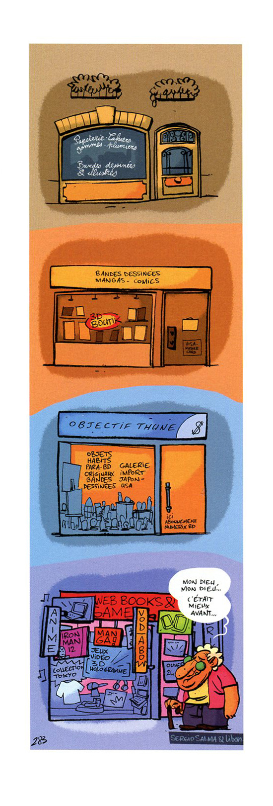 Le sujet ce ne sont pas les auteurs comme dans Le gang Mazda ou Lampil (ou l’atelier mastodonte dans Spirou et des dizaines d’autobios d’artistes) en réalité, l’idée principale c’est que c’est un commerce. L’idée du commerce est géniale ; c’est un petit théâtre, ça pourrait être joué comme les brèves de comptoir.