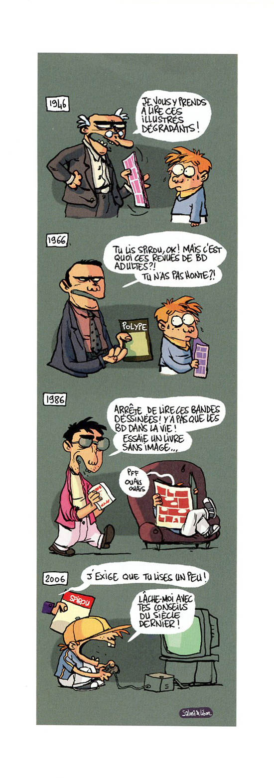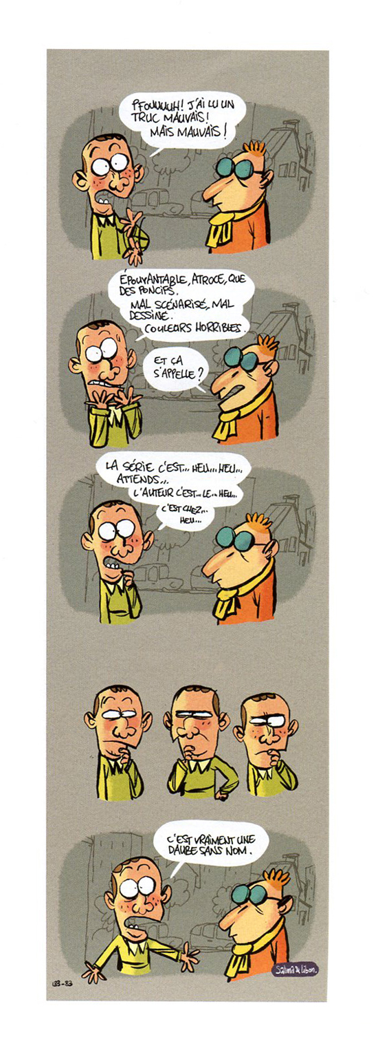 SERGIO SALMA : J’étais dans la rédaction, je causais avec le rédac’ chef Olivier Van Vaerenbergh) et je lui dis : « tiens une bd sur les lecteurs – bd et romans d’ailleurs – qu’est-ce que t’en dis ? » Oui qu’il dit, envoie. Je traîne des semaines, il me dit : « je vais lancer une nouvelle formule, j’aimerais bien, pourquoi pas un strip » ; je dis « ok strip hebdo », je vois Libon avec Jacques le lézard et je me dis que ce serait bien dessiné par lui. Olivier revient et me dit : « Qu’est-ce que tu penserais si Libon le dessinait ? hm ? » On a envoyé les scénarios et hop. Pas un seul accroc. Pas un scénar refusé, le bonheur.
