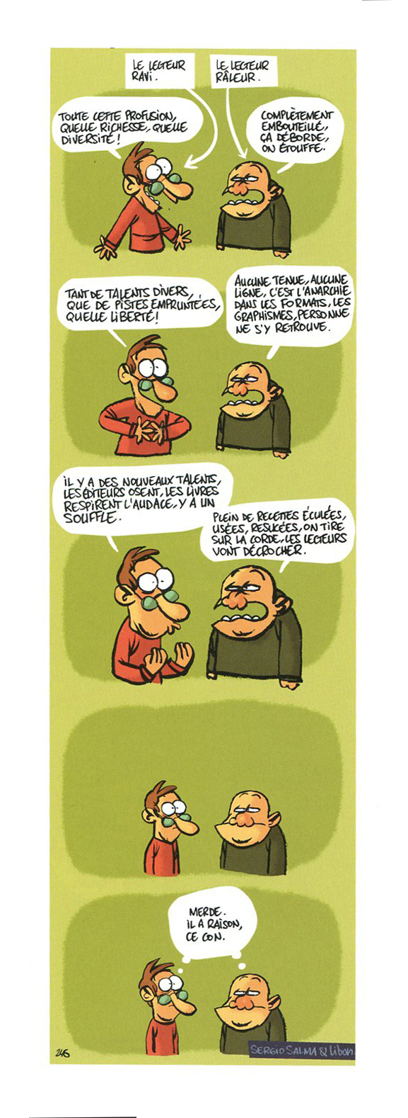 SERGIO SALMA : Le sujet « lecteurs » est vaste. On aurait pu imaginer des lecteurs de livres pas BD, la faune des bibliothèques, des salons du livre… les amateurs d’œuvres littéraires « majeures » ou les simples fous de lecture. Tout ça est un bon sujet. Ou bien encore, pourquoi UN lecteur, un amateur de livres, il y a pas mal de littérature qui parle de… livres (bibles, livres anciens, grimoires etc…), c’est riche.