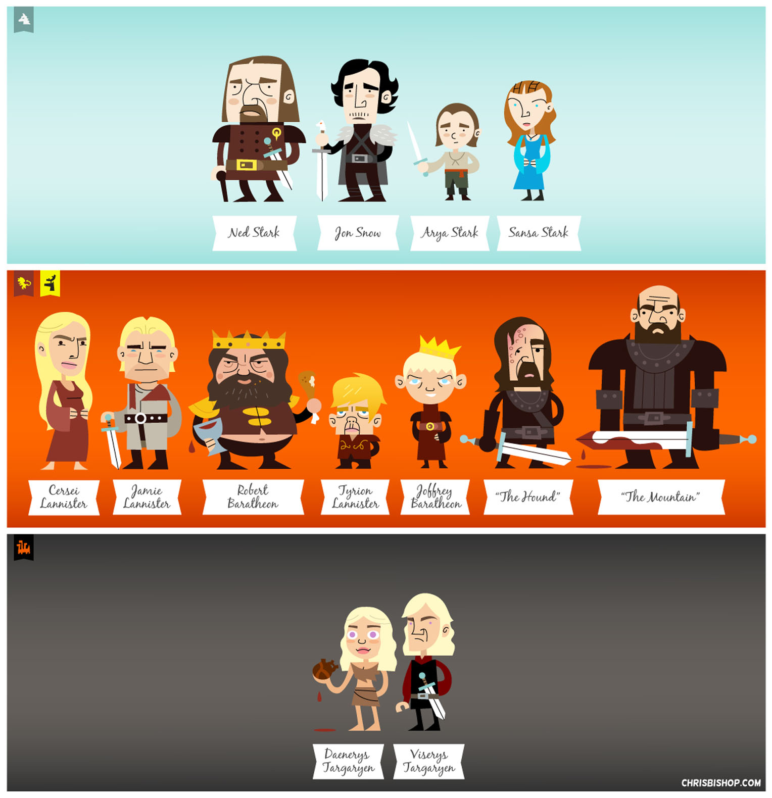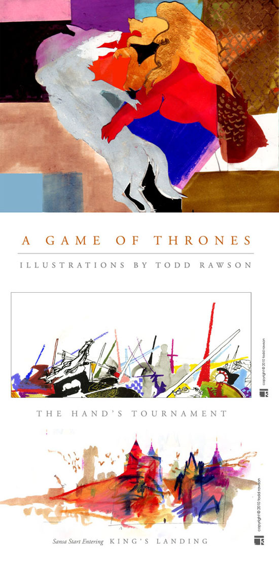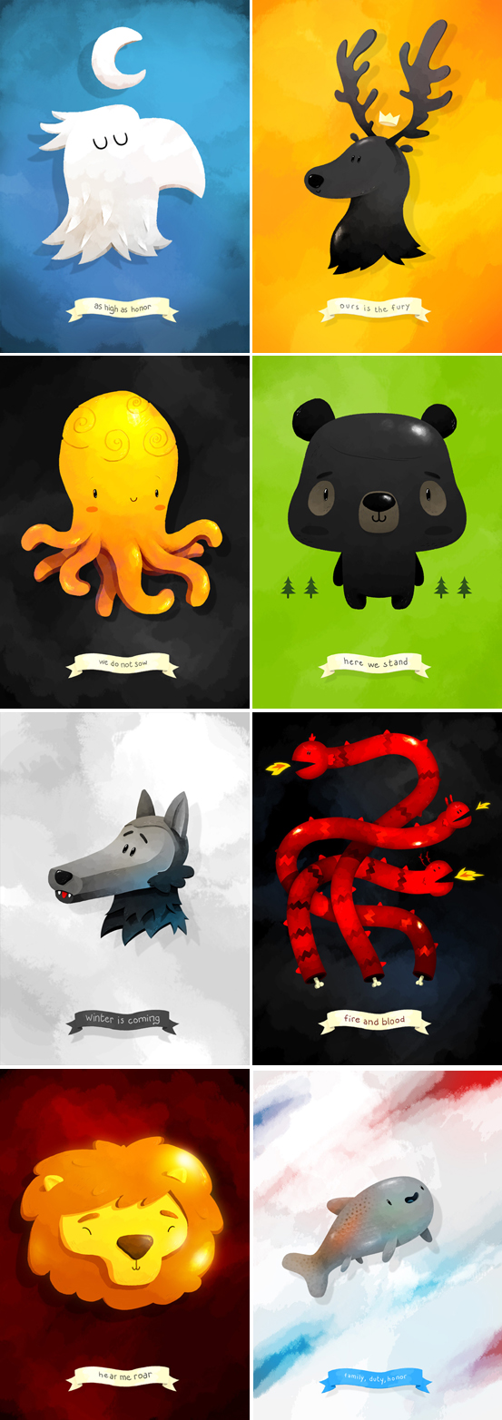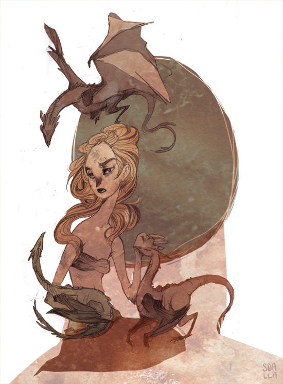 Cela n’a heureusement pas empêché de nombreux illustrateurs de donner sur leurs blogs ou sites une interprétation personnelle et assez loin des canons de l’illustration de genre. Globalement ce qui nous a intéressé c’est le changement de registre, un style semi-réaliste ou parfois franchement comique qui prouve qu’une vision un peu décalée est souvent plus fidèle à l’esprit du chef d’œuvre de Georges R. R. Martin.