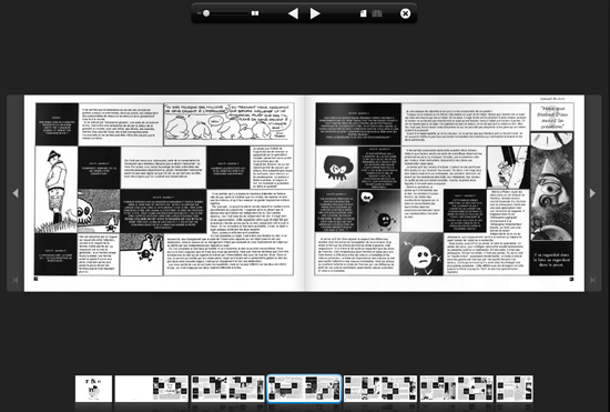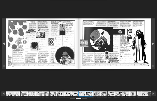 La couverture (format à l’italienne comme le numéro 1) est découpée en son centre d’un hexagone montrant un cube dessiné par Mano sur la première page. Simple, évident, et en situation pour introduire Andreas en rapport avec Escher. Des illustrations quasi 3D car photos de figurines crées par Cartagag sont intégrées aux multiples dessins d’Andreas. Les textes sont aussi franchement tranchés de traits extraits des albums de l’interviewé alors que flotte deci delà, dès les alentours de la découpe initiale, la tache clonée de Cromwell Stone.
