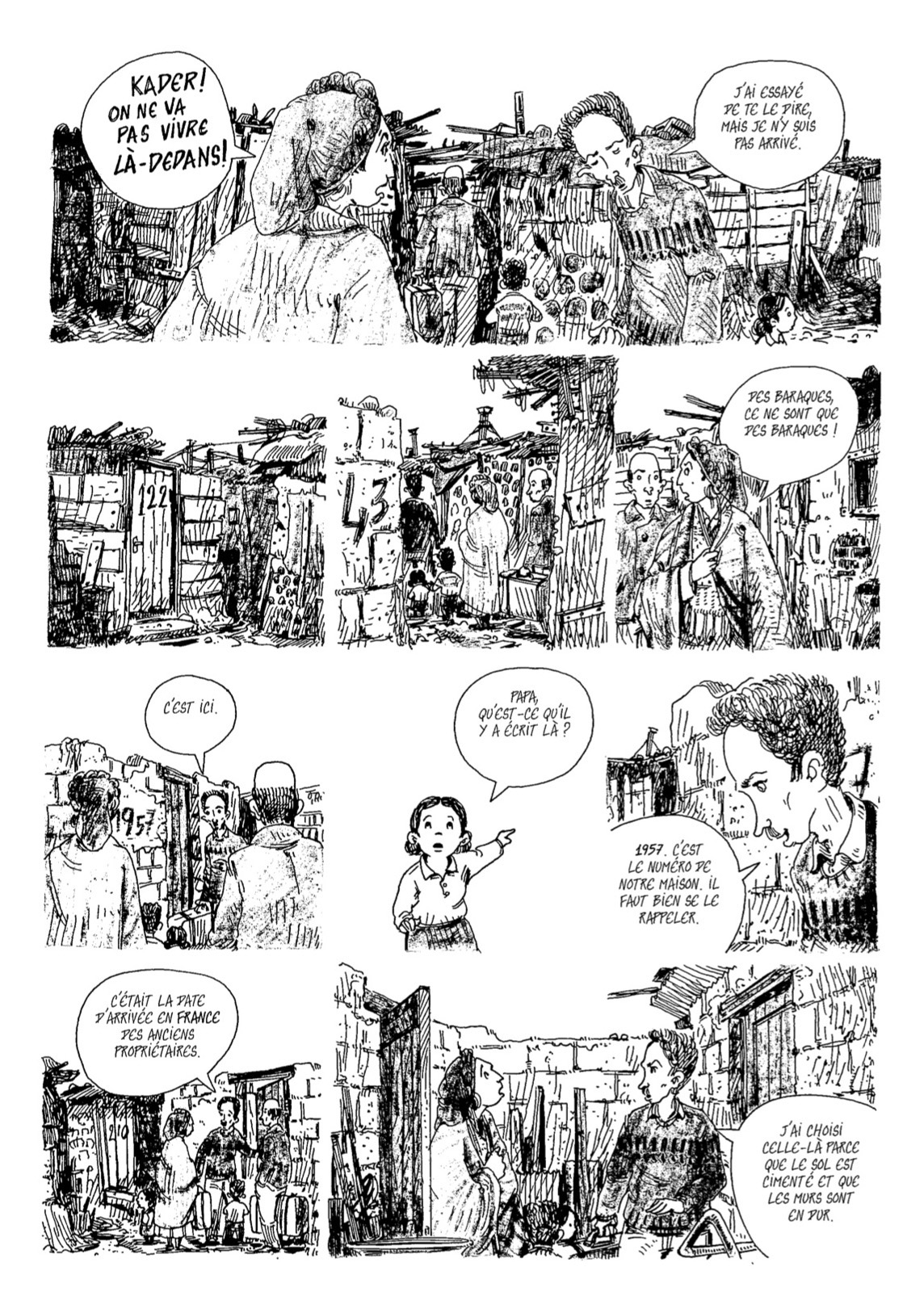 « C’est en 1959, après avoir lu un article de presse relatant un incendie dans un bidonville « Nord-Africain » de Nanterre, que Monique Hervo se rend pour la première fois à La Folie » : l’auteur livre ses sources en complément de son récit, avec des photos montrant pour de vrai ce qu’il dessine aussi bien avant cette conclusion froidement factuelle. Cela renforce une bande dessinée qui pourtant se suffirait à elle-même tant son dessin n’édulcore rien et décrit tout de l’intérieur, des personnages jusqu’à leur pitoyable décor. Une BD historique oui, mais sans les apparats du genre. Pas de costume grand siècle mais des gens cachant les habits de leurs terre d’origine dans des malles pour porter ceux de leur exil en tant que cache misère. Pas de grandes aventures de princes ou d’explorateur mais l’histoire, la vraie, celle des personnes qui la vive au plus près d’un monde qui devient le notre.