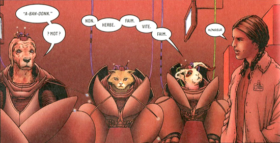Si NOU3 est visiblement un album mineur c’est aussi par ce biais qu’il condense les sujets habituels de Morrison. Mineur car consacré à ceux que l’on appelle parfois nos frères inférieurs : les animaux, mais fidèle au thèmes de l’auteur car à la fois glorifiés et radicalement révoltés sont nos amis les bêtes. « We3 » soit « We free », le titre originel étant bien plus parlant que cette traduction bêtement littérale.