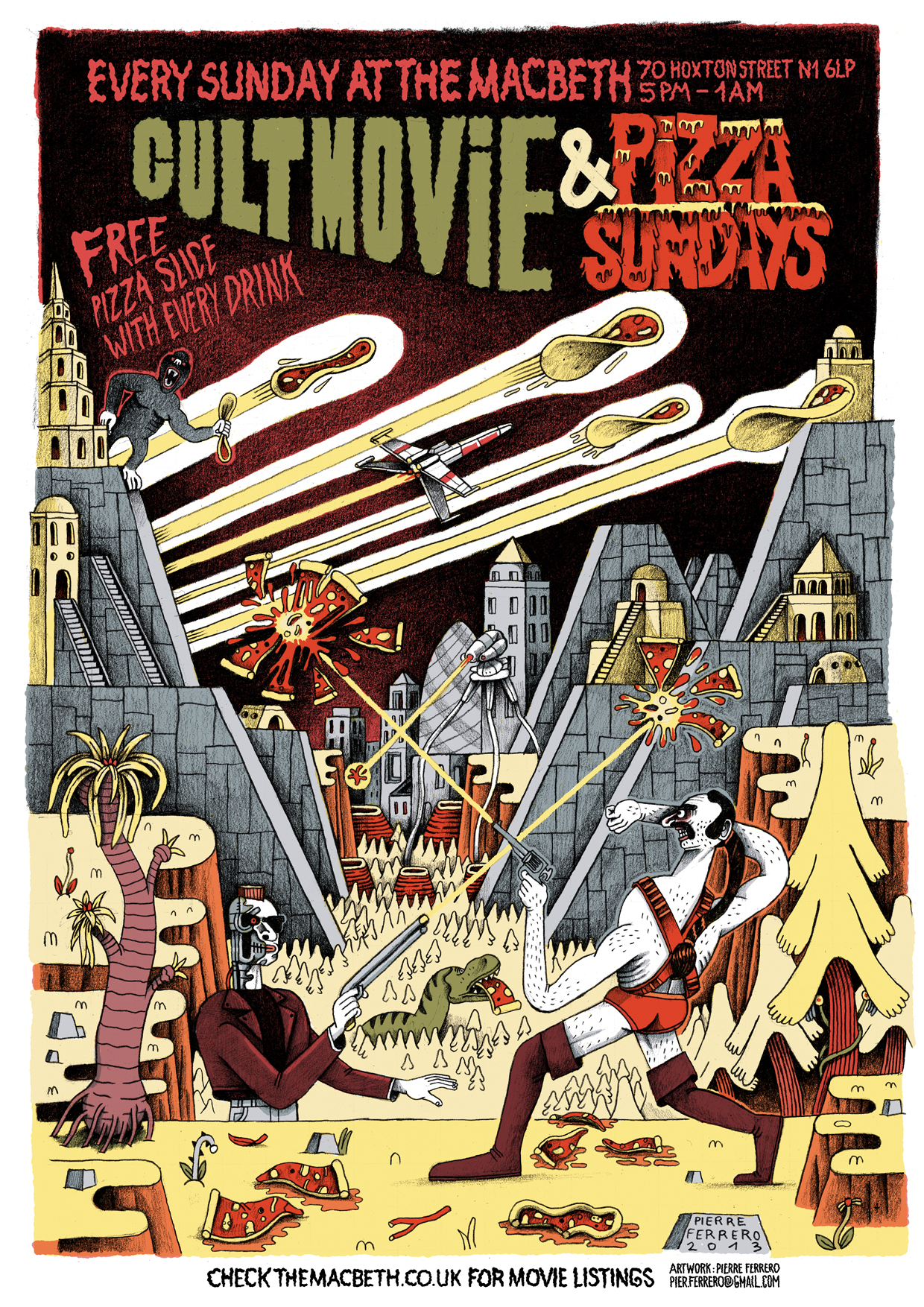 Un cinéma également hyper-représenté cette fois, avec les affiches du futur Takahata dont le titre japonais nous échappe une peu (on se contentera d’un ?), d’une prochaine série HBO (Banshee), d’un hommage à Il était une fois dans l’ouest, d’un documentaire sur Wayne White – l’artiste « derrière l’univers de Pee-wee »- pour finir enfin par un festival espagnol et une affiche pour des séances de ciné-cult en angleterre !