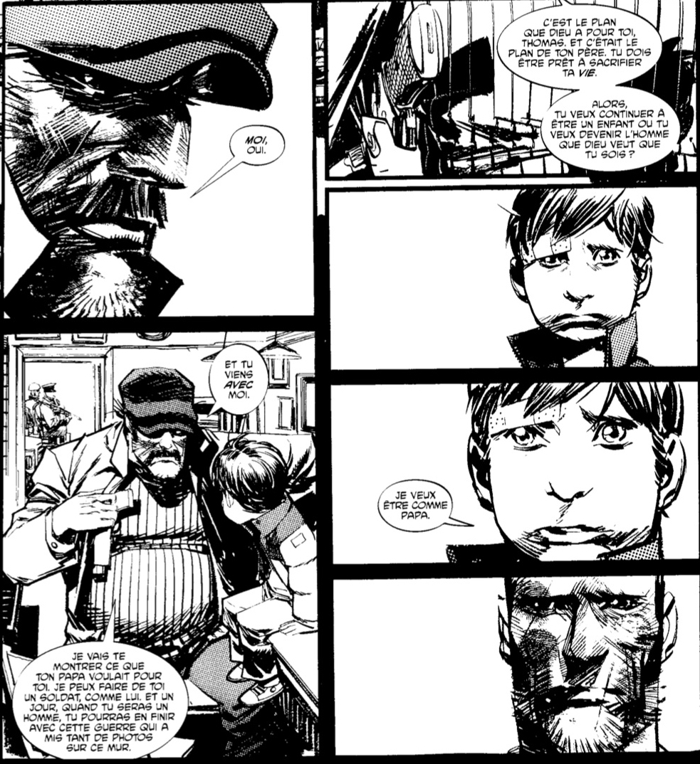 Et non d’un prêche. On le connaissait dessinateur d’une histoire d’Hellblazer, Mauvais sang : on retrouve ici sa violence graphique. On a parlé écemment ici de son dessin précis et structuré donnant une âme au récit de Morrison, Joe, l’aventure intérieur, il anime ici, épuré par un noir & blanc éclatant, une histoire qui lui est propre.