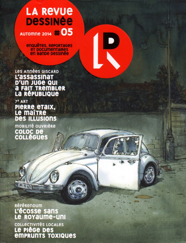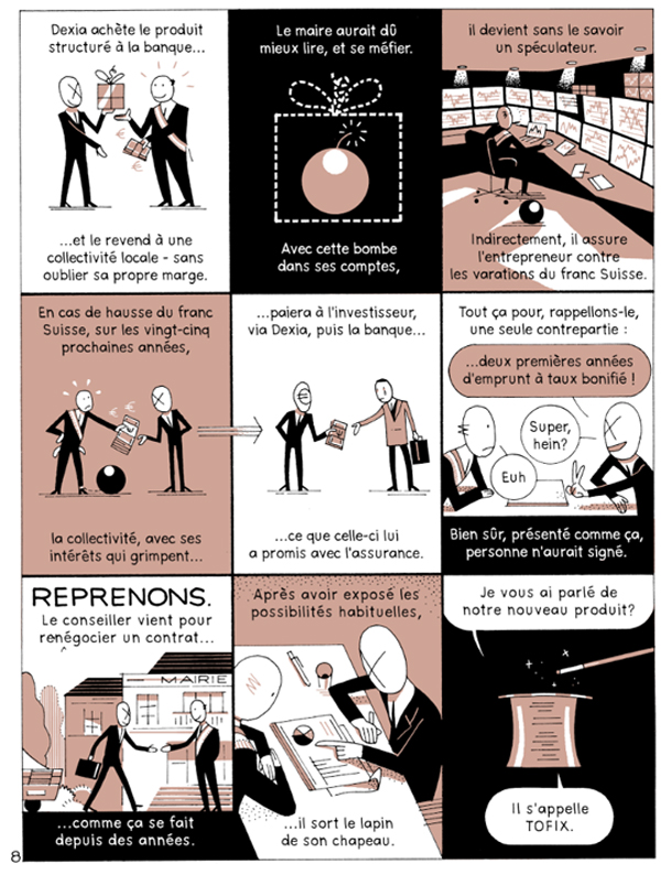 A ce sujet, dans les oeuvres en course pour le Prix cette année à Darnetal était aussi glissé le dernier numéro de ‘La Revue Dessinée ». Aucune chance de gagner quoique ce soit mais l’idée de souligner l’existence de cette superbe revue est judicieuse, d’autant plus que Benjamin Adam y est aussi présent. Ce n’est pas sans rapport avec l’album et son décors qui nous intéresse ici puisqu’il illustre un long article sur les emprunts toxiques que des milliers de collectivités locales ont souscrit auprès de la défunte banque Dexia. Sujet austère donc mais pourtant passionnant tant Adam s’y est investi.Il a d’ailleurs d’autres projets en cours pour cette revue d’autant plus miraculeuse qu’elle renouvelle une presse sensée agoniser.