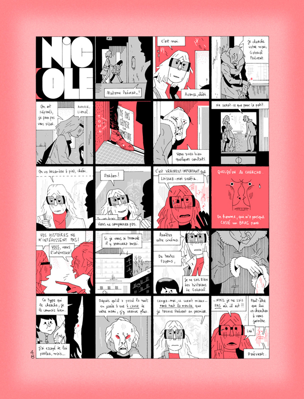 D’abord il y a Lartigues. Barbu qui se rasera suite à une rencontre féminine dans un train où il semble fuir avec son compère Prévert. Lui est gérant d »épicerie mais magouilleur aussi. Divorcé et père surtout mais l’histoire amène ses personnages discrètement. Les principaux sont détaillés sur quelques pleines pages de visages lâchant de courtes phrases comme autant d’indices éclairant le récit. Brian Michael Bendis, le scénariste de Comics a popularisé un procédé de ce genre, Adam est dans ce style à ces moments là mais avec une originalité autrement signifiante. A l’inverse, pour situer mais c’est de circonstance, une inspiration plate de ce genre vous la trouverez dans Inoxydable qui n’hésite pas dans l’empreint direct sur double page. Il cite Powers l’oeuvre majeure de Bendis mais c’est quand même gonflé et gratuit (et reprendre le logo de Marvel est risqué !).